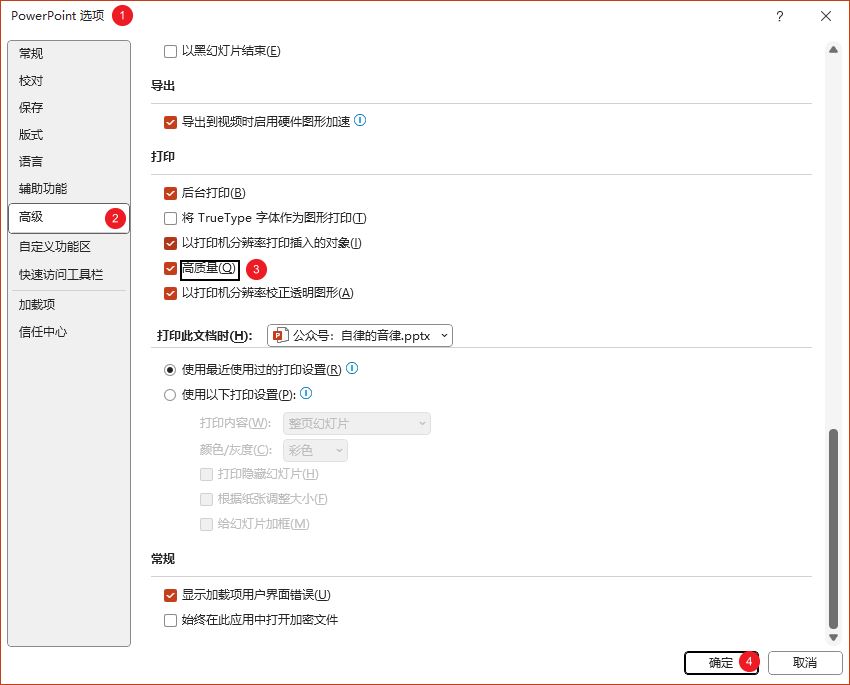 打开 PPT 选项,点击高级,拉到最底部,在打印设置中勾选“高质量”: