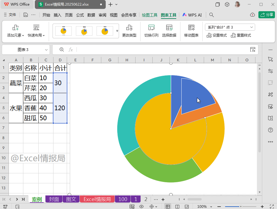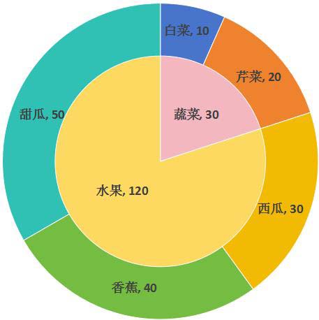 在实际工作中,经常需要制作图表,尤其是饼图一类的,那你知道如何用Excel制作双层饼图让内容层次关系一目了然呢?详细请看下文介绍。答疑解惑SOS:如何做一个双层饼图?如下图所示: ①一级分类:包括“蔬菜+合计30”,二级