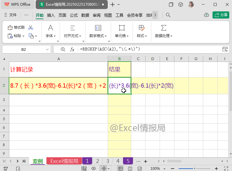 A2单元格是计算过程的记录:8.7(长)*3.6(宽)-6.1(长)*2(宽)+2,不仅含有原始的文本核心算式:8.7*3.6-6.1*2+2,并且在数字后面还标注了带括号的长或宽的信息。并且括号格式还不一致,有些是中文全角的,有些是英文半角的,这些特殊处理细节都对B2单元格的计算结果增加了难度。