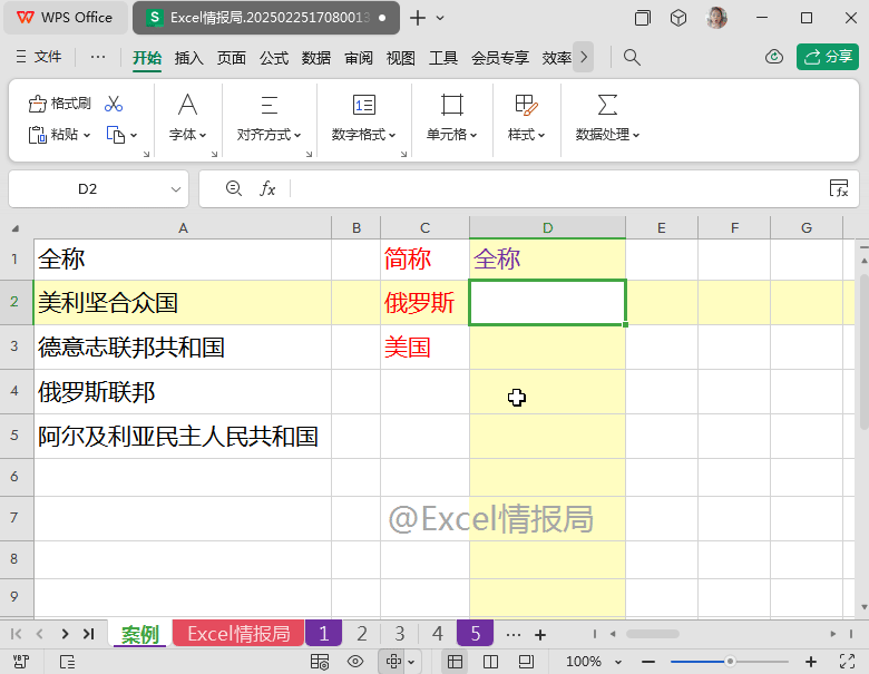 我们用一个例子,来做说明。如下图所示:A列是某些国家的全称,也就是数据源。C列是已知的国家名称的简称,我们想要通过C列的简称,将A列中对应的全称查找出来,显示在D列。