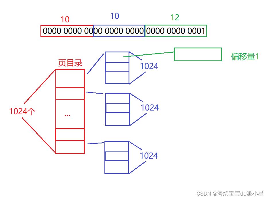 借助这样的结构,就可以使得整个页表的体积大大减小,但是更为重要的是,此时找到的就是物理内存中的页框了,但是在平时进行访问的时候其实并不关心页框,关心的是页框中的某一个数据,但是只需要借助最后的偏移量就可以找到了,只需要由前10个比特位找到页目录,然后再通过下标找到对应的页表,再通过中间的10个比特位找到对应的页表项,再通过页表项的内容找到页框,再通过最后的这个偏移量来找到所需要的数据内容