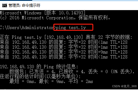 2、检测ServerB是否能ping通“test.ly”,如果能ping通继续下一步,不能则返回上一步操作;如下图表示ping通;