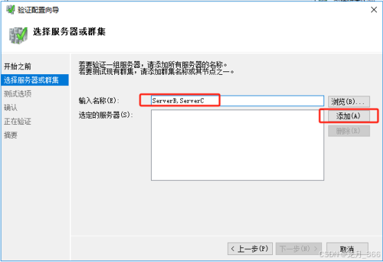 3、在“选择服务器或者群集”,输入需要添加的服务器名称,多个用“,”分开,然后点击“添加”;