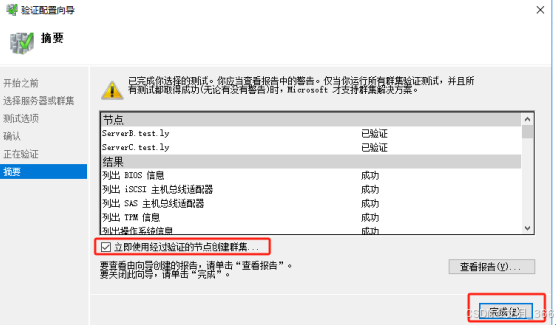 7、等待验证完后,在“摘要”上,选择“立即使用经过验证的节点创建群集”,然后点击“完成”;