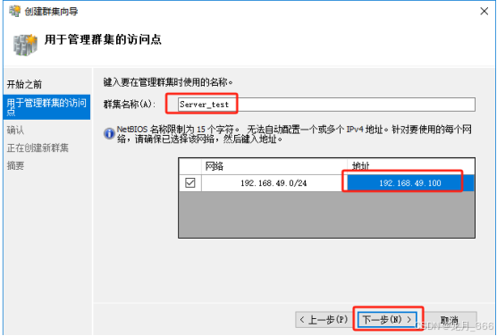 9、在“用于管理群集的访问点”,输入群集名称“Server_test”,地址为“192.168.49.100”,然后点击“下一步”;