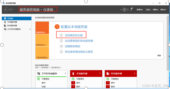 1、打开“服务器管理仪表板”,点击界面上的“添加角色和功能”;