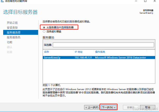 4、在“服务器选择”,选择“从服务器池中选择服务器”,然后点击“下一步”;