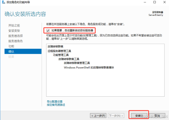 7、在“确认”上,选择“如果需要,自动重新启动目标服务器”,然后点击”安装”;