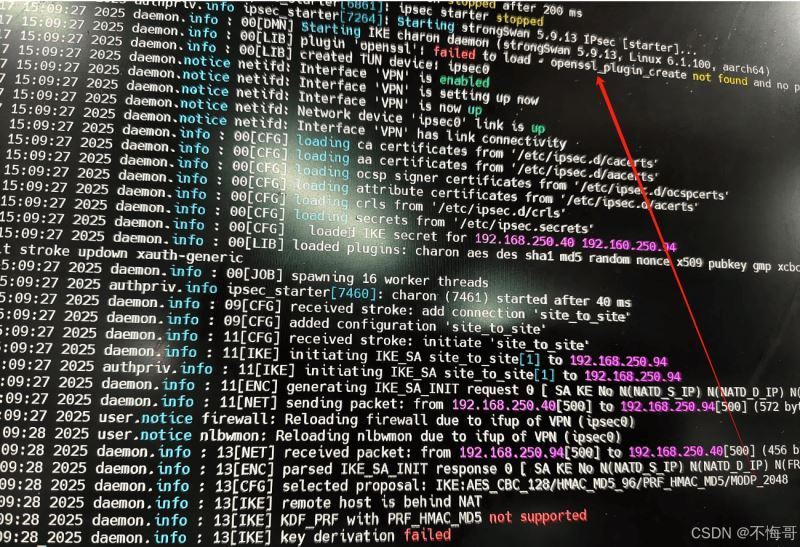 我们配置好ipsec.conf后,发现死活连接不上,up前面一直是0,然后做了一个尝试,把配置文件里面的ipsec.conf里面的ikv2改成了ikv1发现连接上了,之前一直怀疑加密算法有问题,看来加密算法是没有问题,此刻阻塞了。刚好手机拍下了日志,把日志往群里发了一下,细心的群友看出了问题点。
