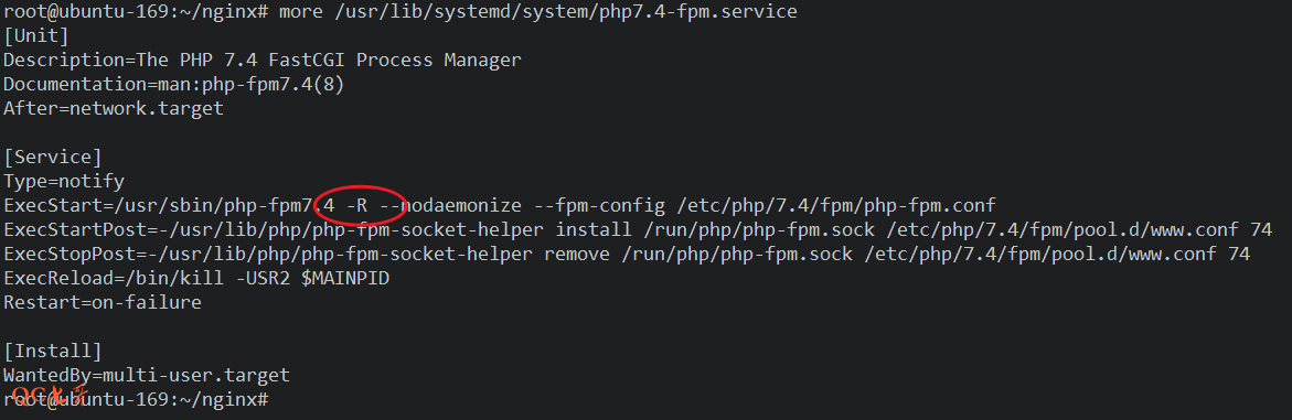 在 /usr/lib/systemd/system/php7.4-fpm.service 文件的启动命令加一个 R 参数,允许以 root 启动