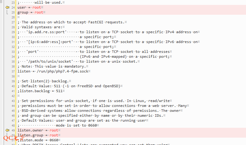 修改 /etc/php/7.4/fpm/pool.d/www.conf 配置文件,将下面的 user、group 改为 root 用户