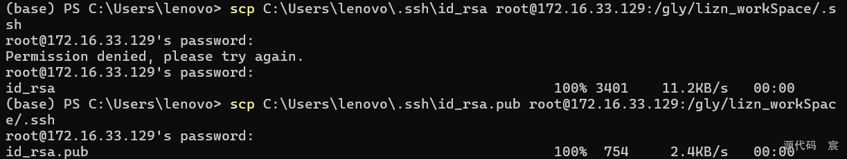PS C:\Users\lenovo>scp C:\Users\lenovo\.ssh\id_rsa UserName@HostIP:/home/XX/.ssh PS C:\Users\lenovo>scp C:\Users\lenovo\.ssh\id_rsa.pub UserName@HostIP:/home/XX/.ssh