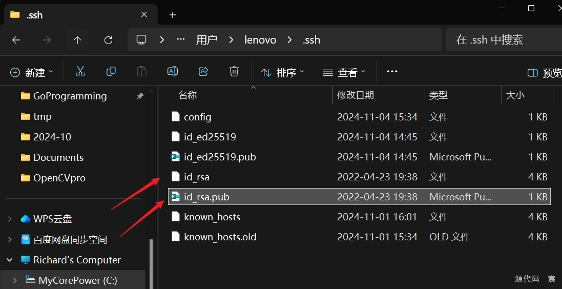 连续按3次“enter”,则“C:\Users\lenovo.ssh”内容会生成一对密钥,如下: