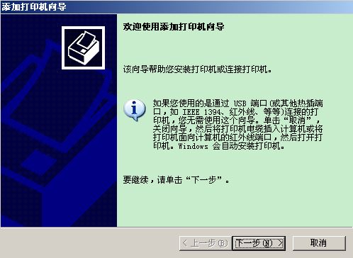 2.在弹出的打印机安装向导窗口中,用鼠标单击“下一步”按钮,如下图所示。