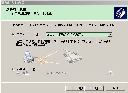 4.明确打印机使用的端口,针式打印机一般采用lpt1端口。用鼠标单击“下一步”按钮,如下图所示。