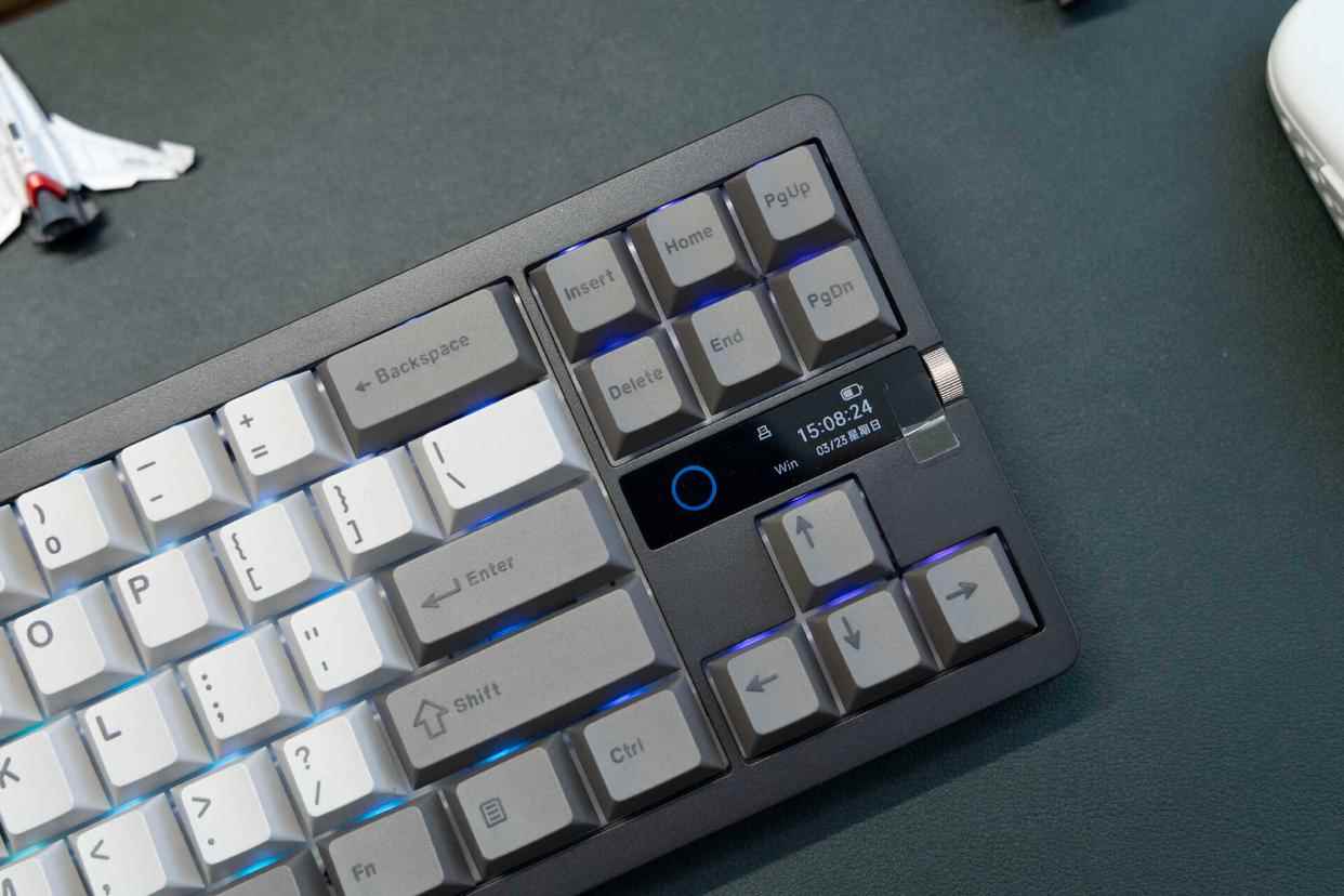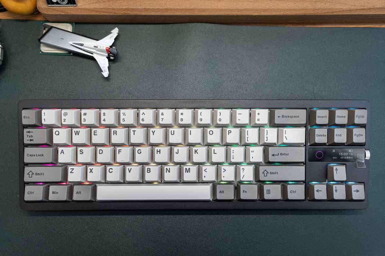 键盘全键支持RGB灯效,右侧的显示屏还提供了一组氛围灯。暗光环境下,这种露而不透的灯效表现更为高级。