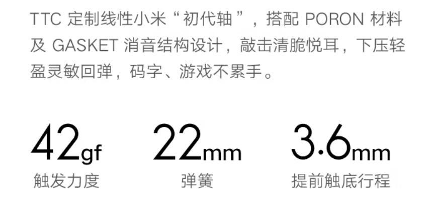 官方参数显示,这款轴体的键程为3.6mm,线性手感,触发压力42gf,手感轻盈安静,弹簧22mm,反弹手感轻盈顺滑。