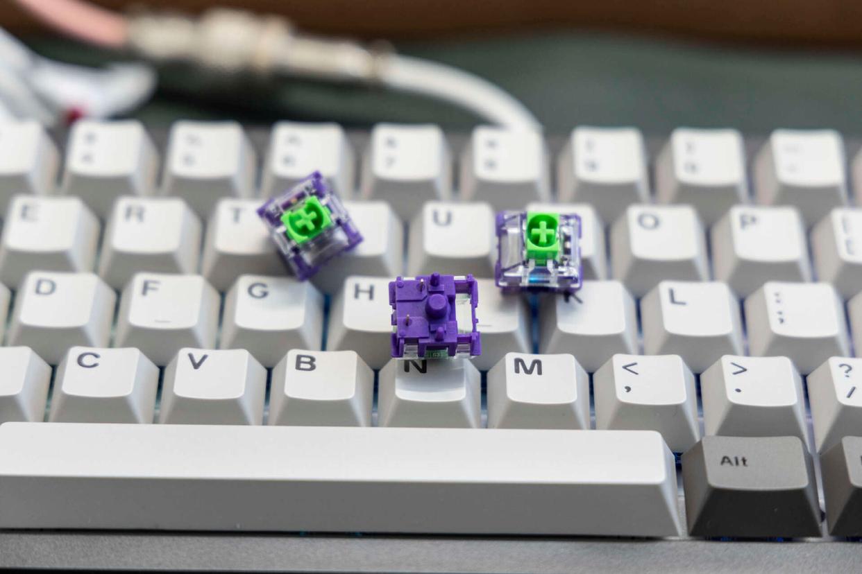 小米MK71 Pro这款键盘配置的是TTC定制的特殊轴体,配色为高饱和的双色组合,识别度极高。轴体顶部带导光柱设计,底座为五针结构。