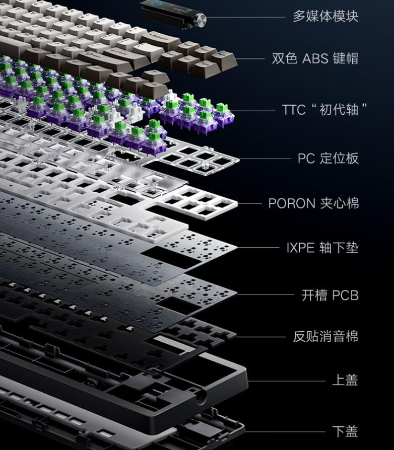 键盘结构的爆炸图如上,Gasket结构和PORON夹心棉等多层消音材质,让键盘的手感更软弹,声音更纯净。