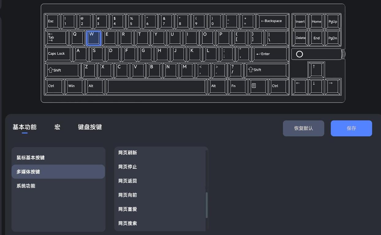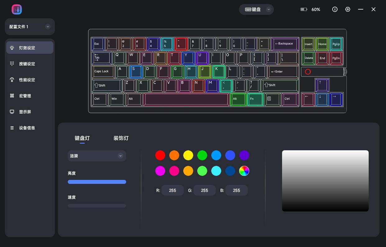 驱动界面设计的非常成熟,提供了灯效设定,按键设定,性能设定,宏管理,显示屏,设备信息多个子菜单,并且所有的设置完成后,还能存入键盘预设中,便于用户根据使用需求快速调取。