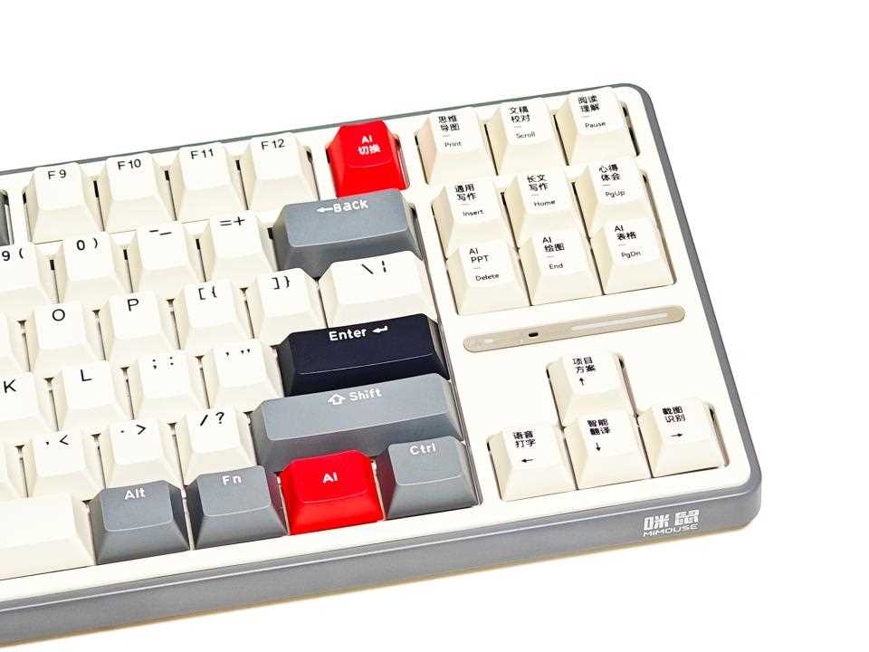 咪鼠MK87 AI机械键盘左侧与普通键盘一致,右侧小键盘上的按键除了具有一些传统功能以外还可以一键切换为AI按键模式。按键上都有汉字,用来描述按键对应的AI功能,有了这款键盘就可以一键启动思维导图、文稿校对、阅读理解、长文写作、AI PPT、AI绘图、AI表格、语音打字、智能翻译、截图识别等功能。在方向按键上方还有一个灰色的装饰条,最左侧为大小写指示灯,中间为麦克风孔,右侧为充电或低电量指示灯条。