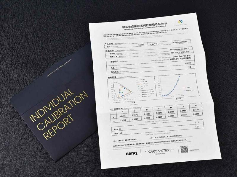 明基工程师在色彩校对上付出巨大努力,以确保色彩准确性,每一台W6050都会附上出厂色准校验报告,保证开箱即用。其精准校对D65色温、Gamma、黑色准位、白色准位、中性灰、RGBCMY、色调、饱和度和亮度,通过色度计对三原色和三副色进行单独调整,直到每一种颜色都尽可能接近标准值,保证ΔE<2,从而实现好莱坞电影的真实色彩再现。