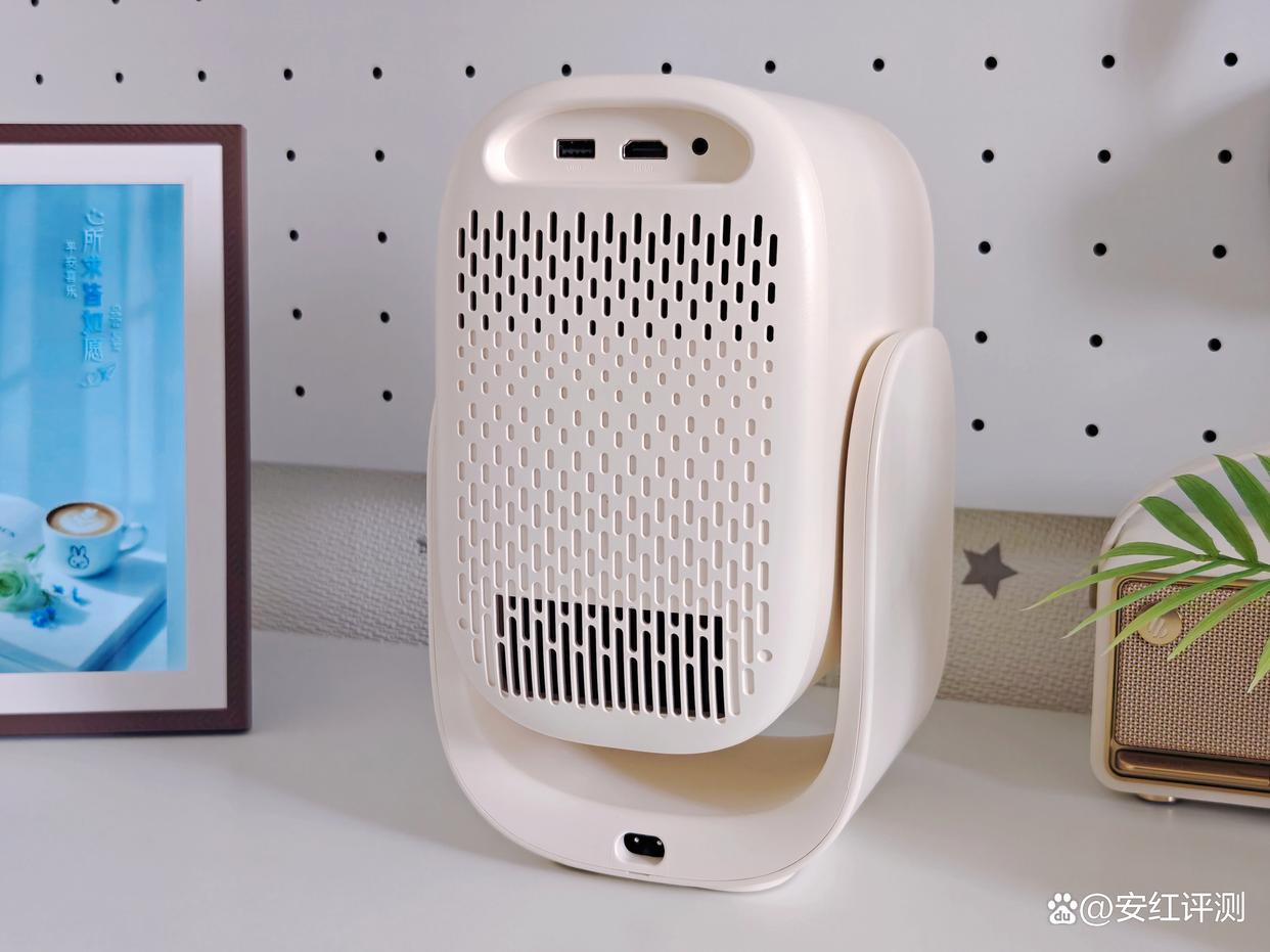背面上部为接口区,横向排从左到右依次为USB接口、HDMI接口和3.5mm Audio接口,这些接口带来了丰富的扩展功能,比如可以连接U盘、电脑、游戏主机等,可以读取数据或者大屏办公娱乐等。下部为散热区,设置了大量的散热孔,这对于投影仪来说非常必要,因为正常运转时,内部产生的热量能够及时快速排出,保证了投影仪不会过热,既保证了投影画面稳定,又延长了内部元器件的使用寿命。