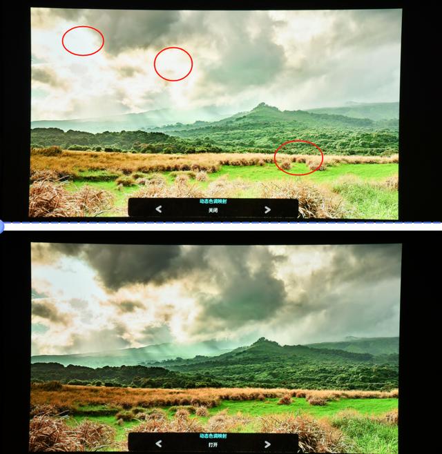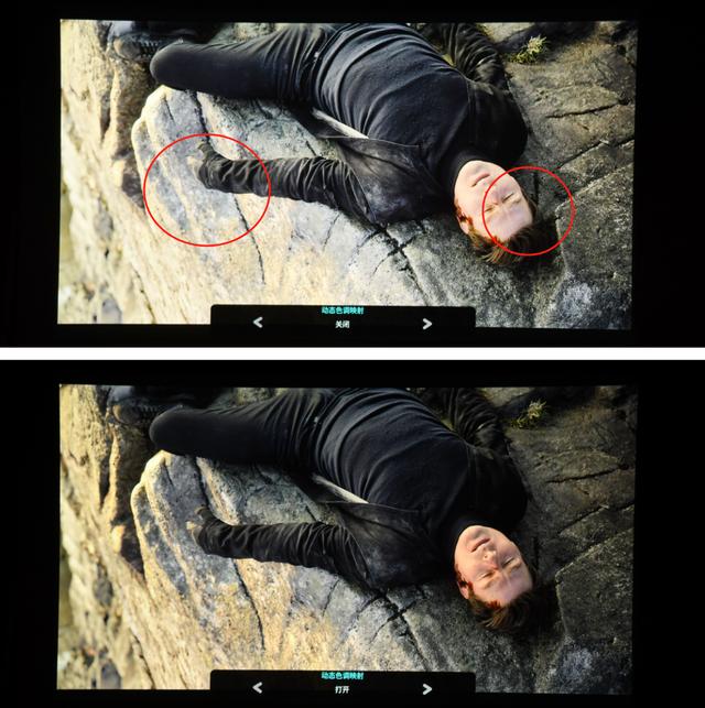 动态逐帧映射技术开启之后,红圈内下图明暗对比更明显,更能体现光影效果