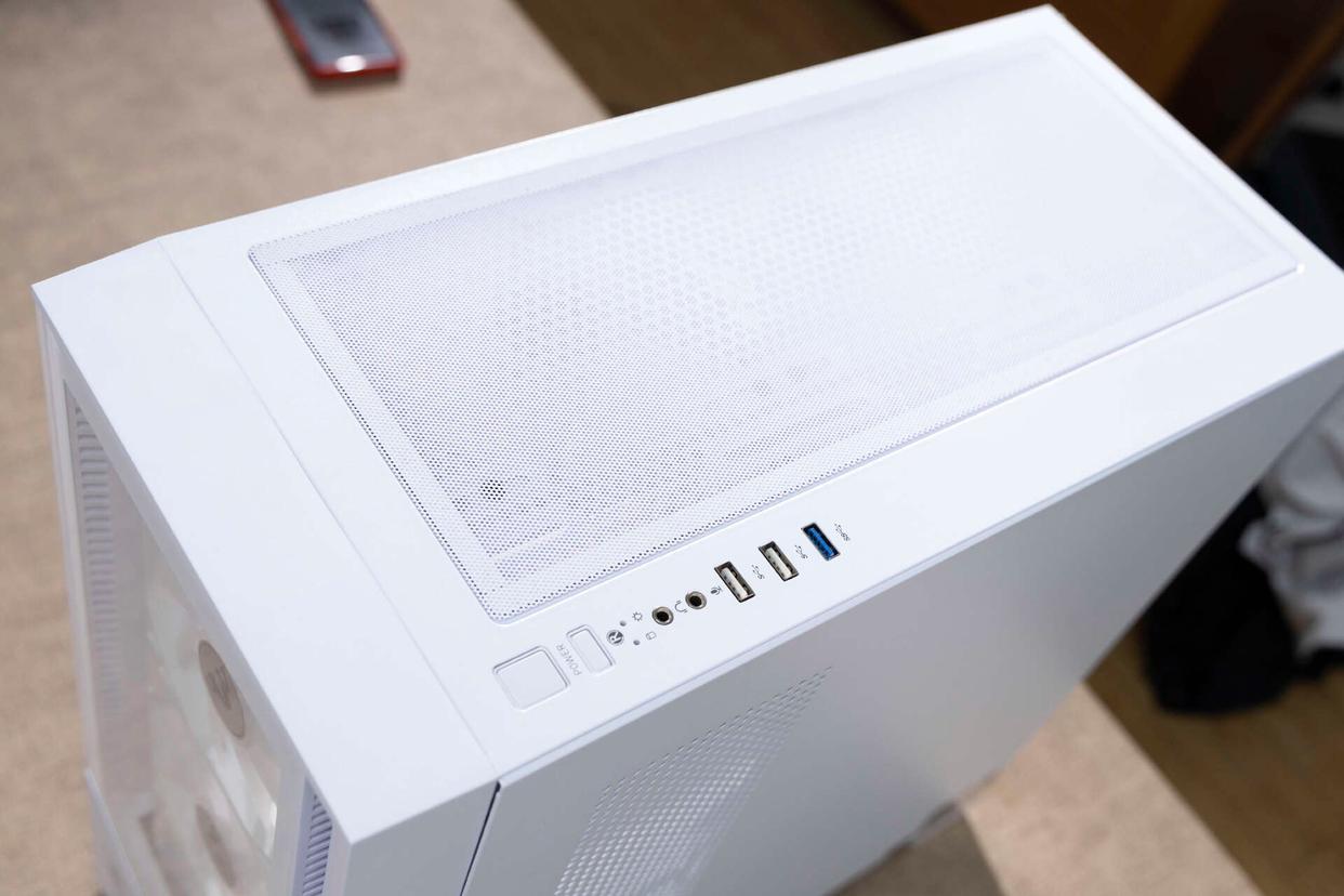 主机的IO面板设置在机箱顶部,提供了电源键,重启键,1个USB 3.0接口和2个USB 2.0接口,音频接口采用了输入和输出独立方案,进一步优化了用户的日常使用体验。