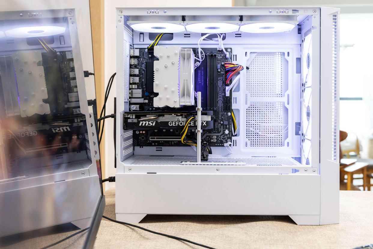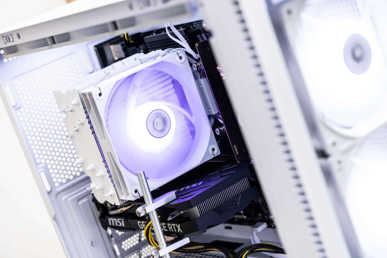 透过主机左侧玻璃面板,可以看到机箱内部配备了MATX主板,散热器方面采用的是风冷散热方案。机箱内部风道设计合理,并且预留了好几个风扇安装位置。显卡方面支持400mm以上长显卡的安装,为日后有升级需求的用户预留了充足的升级空间。