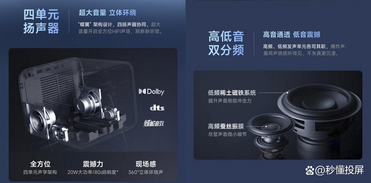 3、M2Pro的提供了四单元双分频Hifi音响。2*10瓦合计20瓦,可达80分贝,支持杜比和DTS与蝰蛇音效。可实现50Hz的低音下潜,我录了一小段视频,大家可稍微感受下。我的感受是音腔大,空间立体感强,人声清晰,低音效果很强。