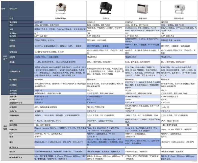 1、是否有性价比?? 站在2025年往回看,事实就是没有一款产品能打得过它。到手价在3300-4100区间的主流智能投影,我都拿出来了,比如当贝X5 S,极米RS 10,坚果N1S 4K,它们的完整配置详情和点评如下。大家自己查看即可。