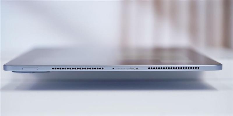 在平板的背面,采用了全金属一体设计,我们手上的配色被称为迷雾灰紫,兼具灰色的沉稳和紫色的优雅,在视觉上给人柔和、高级的感觉,彰显个性的同时,也不易沾染指纹,日常使用能长久保持外观整洁。