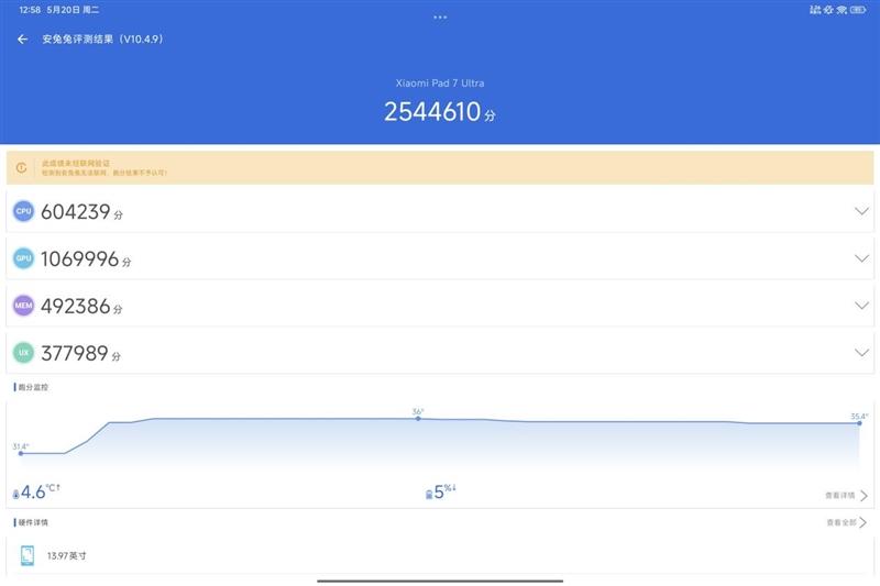游戏实测数据显示,Xiaomi Pad 7 Ultra柔光版在运行高负载游戏后,机身背面最高温度控制在 37.7℃。