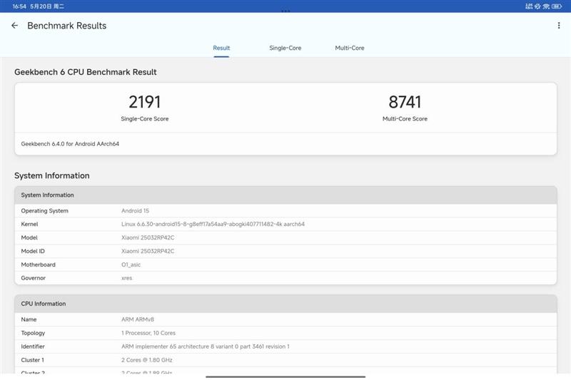 在CPU单项测试中,小米玄戒O1芯片的单核成绩2191分,多核成绩8741分,相比Xiaomi Pad 7 Pro中的骁龙8s Gen3芯片分别领先了约13.75%、71.99%。