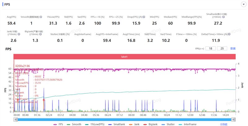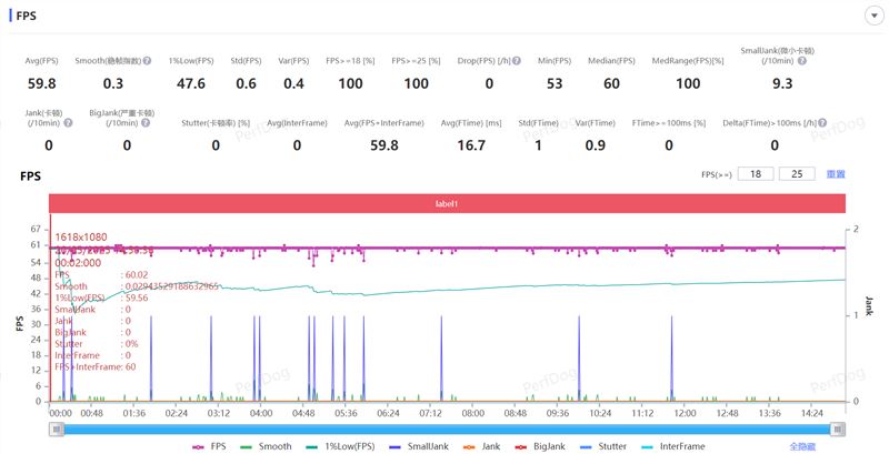 《原神》手游在60帧率+特效拉满的前提下(关闭动态模糊),一局须弥城跑图测试15分钟下来,游戏帧率全程稳定在60FPS水平线上,平均帧率59.8FPS,平均波动仅有0.3。