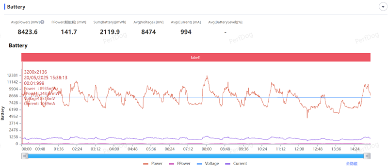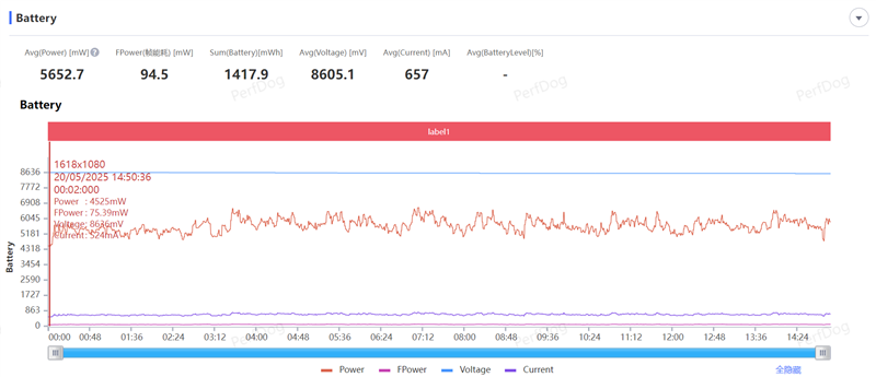 接着我们测试了硬件杀手《崩坏:星穹铁道》手游,最高画质下进行15分钟黄金的时刻跑图测试下来,游戏的帧率稳定在了59.4FPS,可以看到除了战斗场景转场时帧率有较大幅度的波动,绝大多数时间都是一条直线,稳定在58-60FPS区间。
