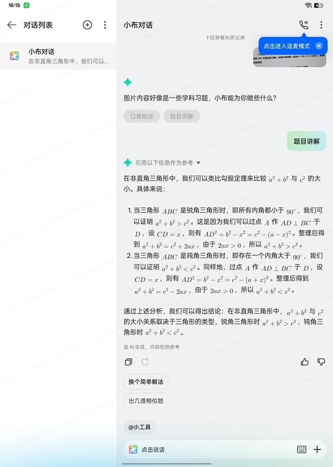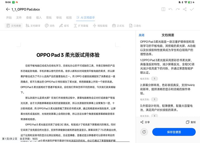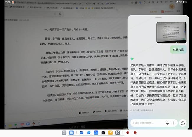 OPPO Pad 3柔光版这次也搭载了ColorOS 15操作系统,通过系统级AI的赋能,来全面提升工作体验和学习体验。在之前的OPPO手机中,我们已经领略到一键问屏的神奇之处,遇到各类不同的问题都可以通过识屏的方式解决,诸如“这个经典在哪里”、“图中的植物是什么”它都能轻松回答。针对学生群体,OPPO Pad 3柔光版还推出了识屏解题功能,基本涵盖了中小学的主要学科,我们试着让它解答了一道中学的几何题,发现证明过程十分清晰,回答得也十分准确;让它总结文言文和英语短文的概要也是十分迅速的。
