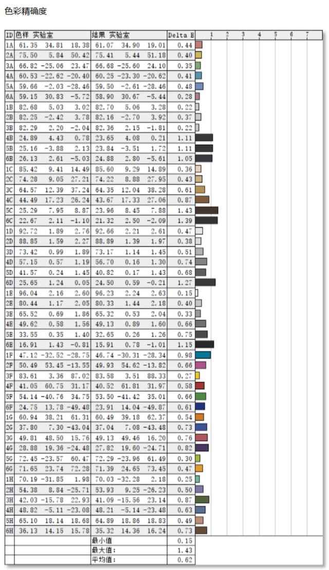 在色彩准确度的测试中,HKC T2755U显示器结果为平均ΔE值为0.62,最大ΔE为1.43。一般来说平均ΔE<2,人眼就基本上分辨不出色彩的差异,HKC T2755U显示器的平均色准低于1,最大值也不超过2,完全能够满足专业工作的需求。