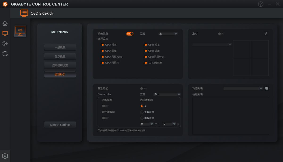 作为一款电竞显示器,技嘉MO27Q28搭载了多种实用的电竞辅助功能,包括分辨率切换,黑平衡2.0、自定义十字准星等。玩家也可以用数据线将PC和显示器的USB Type-B上行接口相连,然后在官网下载技嘉GCC软件。这样就能通过软件直接控制显示器的各项参数,包括预设模式、亮度、色温、Gamma、游戏助手显示,以及KVM控制等。