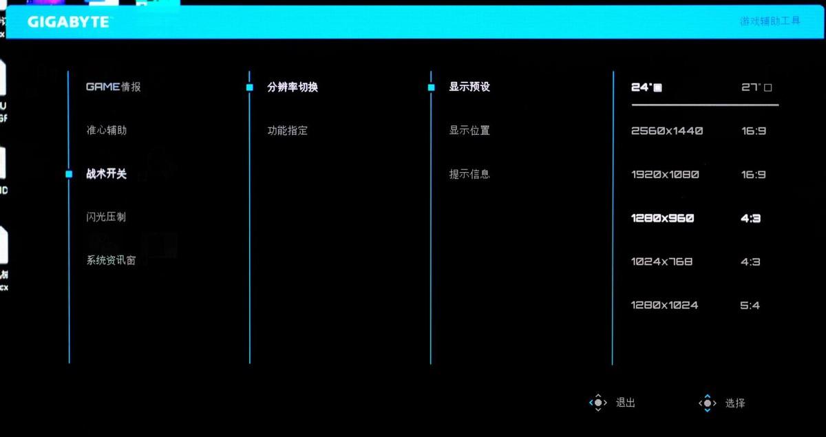 接下来,我们试用了显示器的电竞辅助功能。首先是分辨率切换,通过这个功能显示器可以将分辨率从2K切换为其他分辨率,同时显示大小也可以调节为24英寸。该功能默认绑定在显示器底部的战术开关上,在需要的时候一键开启,对于习惯在小屏模式下游玩FPS游戏的玩家来说是相当实用的功能,不过使用分辨率切换前需要注意将游戏提前设置为窗口模式才可以正常显示。