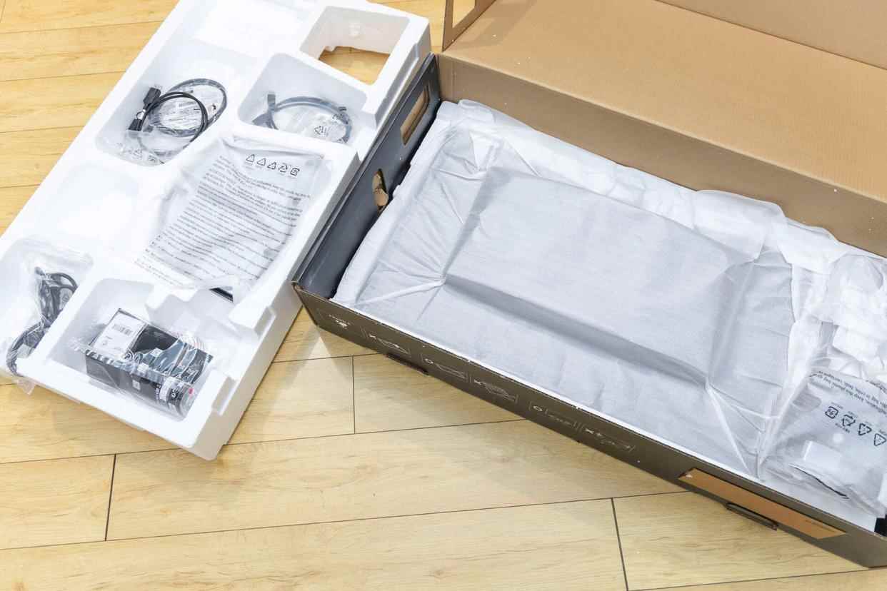 包装箱的内部采用双层布局,增加了厚实的泡沫框架,显示屏主体被牢牢固定,所有配件都有独立包装,保护十分周全。