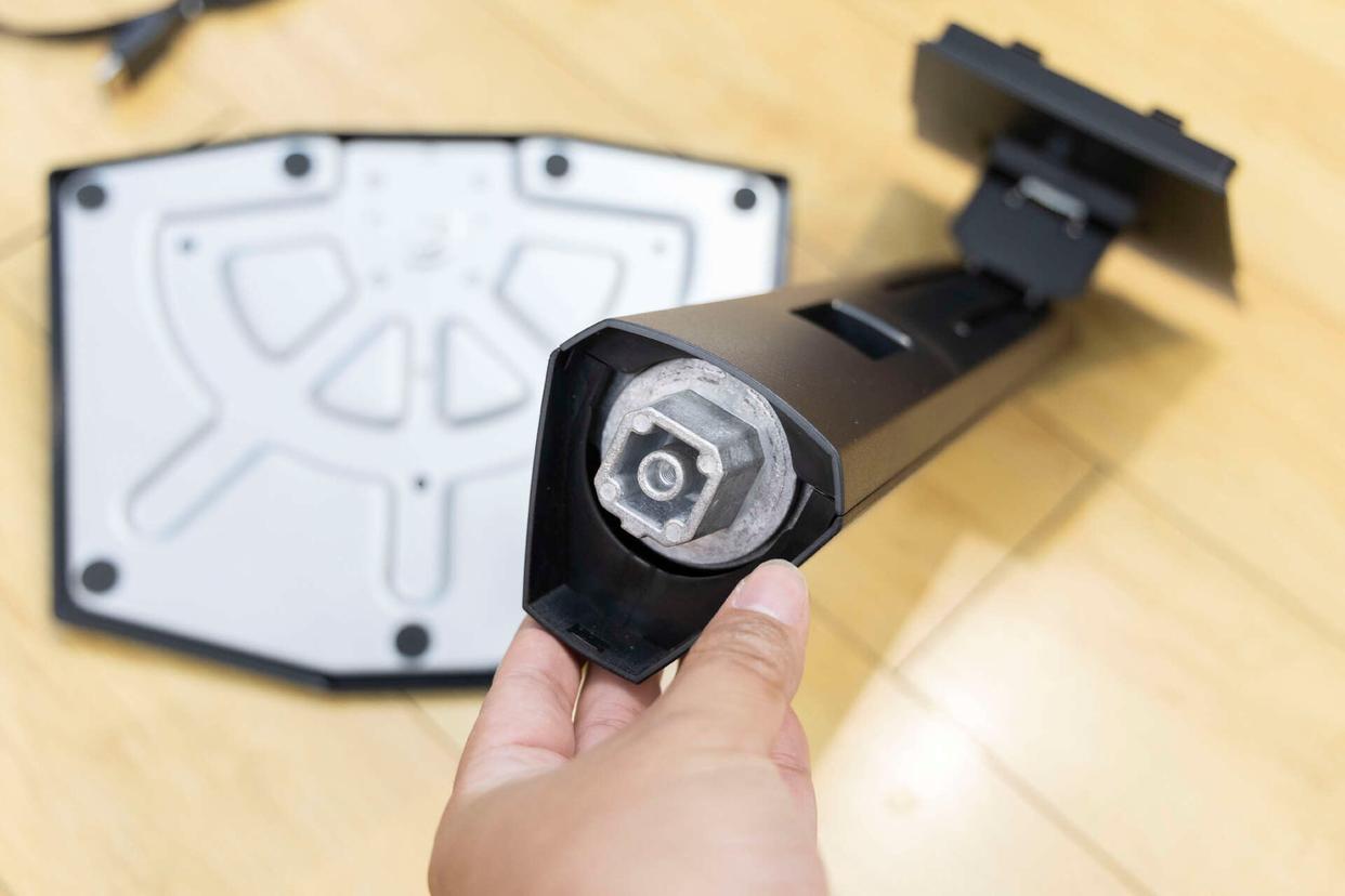 显示器支架组装后,整体重量相当可观,纯平底座可以提供稳定支撑,并且在纵向上优化合理,不会占用太多桌面空间,设计和做工都相当靠谱。