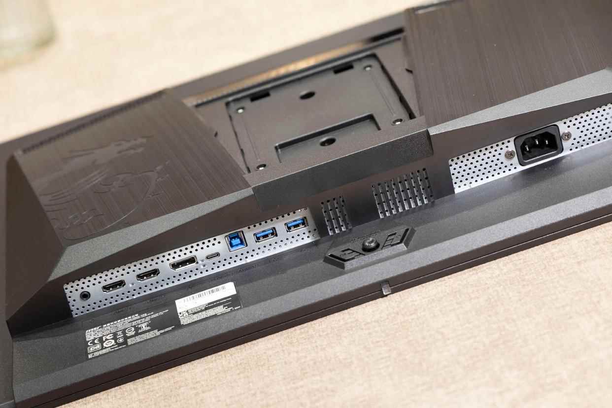微星MPG 322URX QD-OLED采用的内置电源设计,IO面板位于机身背部背包的下方,呈左右两段式布局。