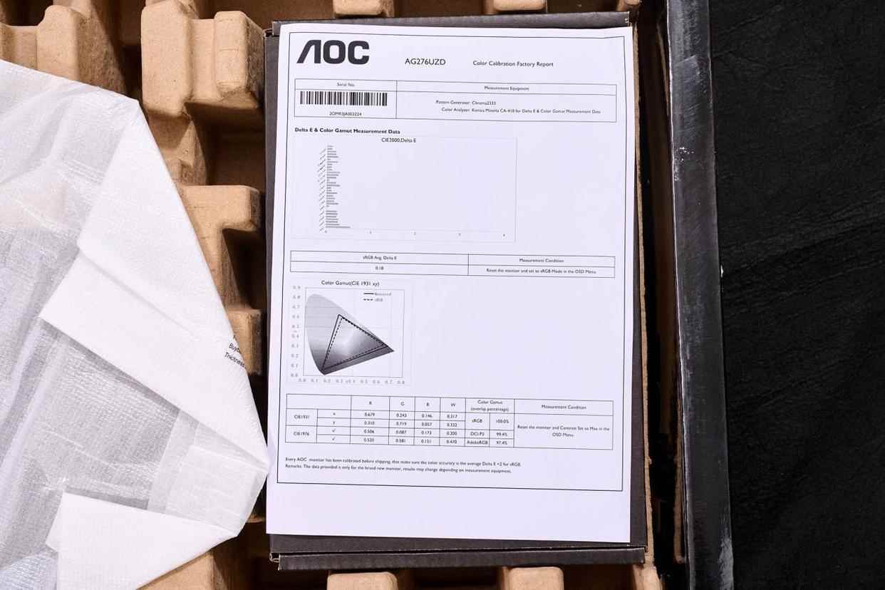 包装内附带一份出厂校色报告,该报告显示其sRGB色域覆盖率达到100%,DCI-P3色域覆盖率为99.4%,AdobeRGB覆盖率为97.4%,并且色准Delta E值小于0.1。