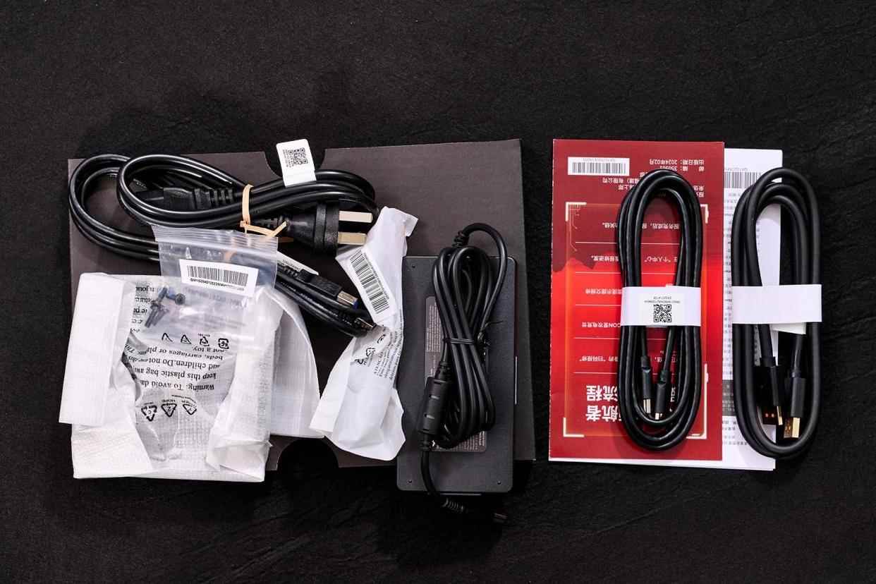 而配件则是相当的丰富,由独立的纸盒包装起来,包括:DP 2.1a 线、HDMI 2.1a 线、USB-B 线、AC电源线、适配器、VESA安装支架,VESA安装螺丝,以及一众使用手册。