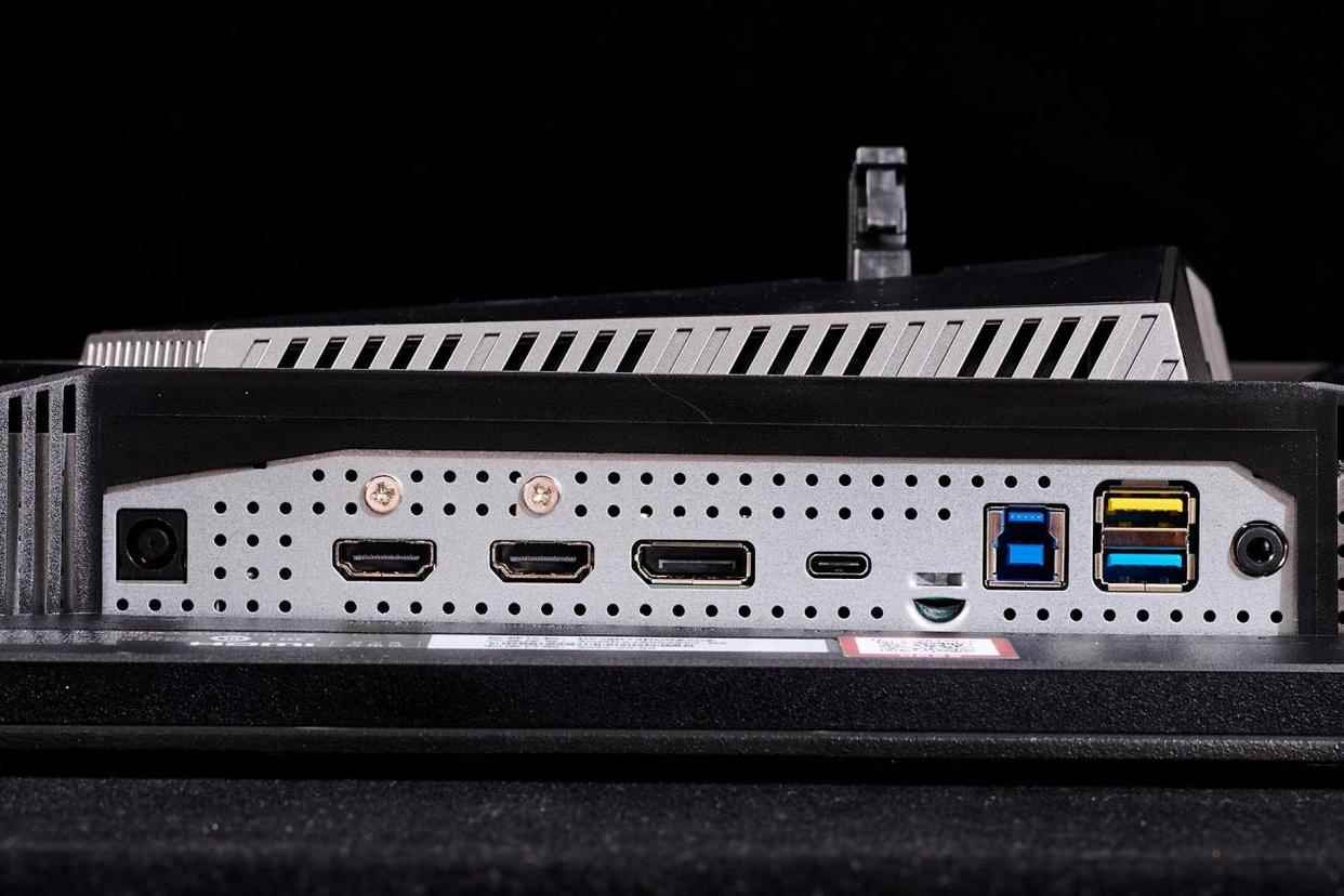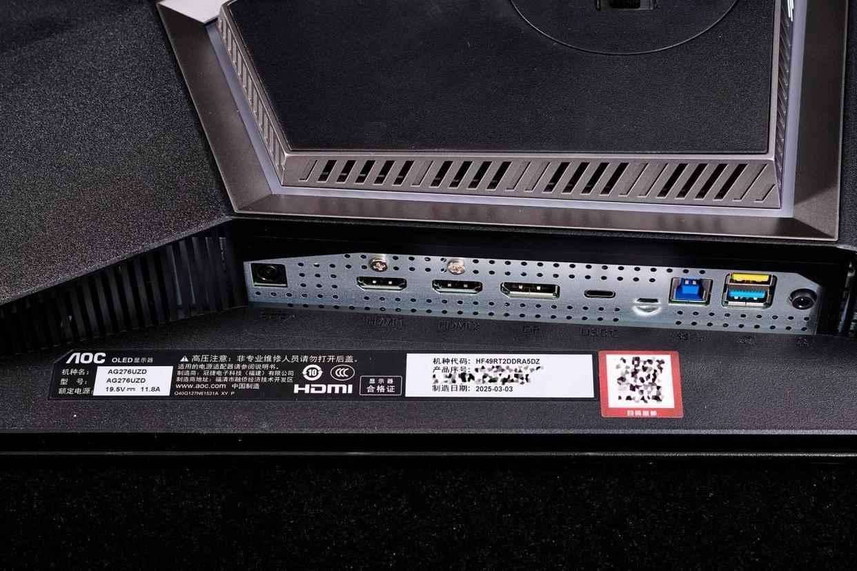 接口是相当丰富的,对应的接口上也有接口标签方便用户连线。从左往右分别为,DC适配器供电接口、2个HDMI 2.1a接口、DP 2.1a接口、Type-C接口(DP Alt显示输出+65W PD供电)、USB上行接口、两个USB3.2接口,以及3.5mm音频输出 接口。