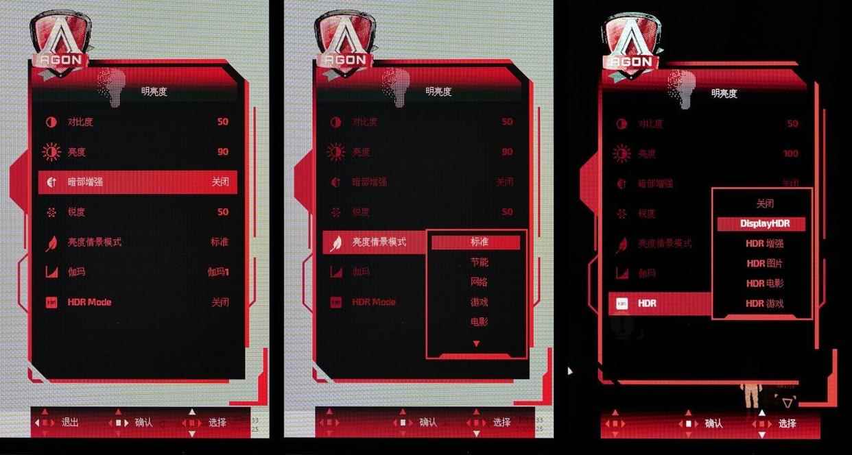 明亮度方面,除了常规的对比度、亮度、锐度、不同的亮度情景模式,以及伽马外。还提供不同的HDR模式选择。