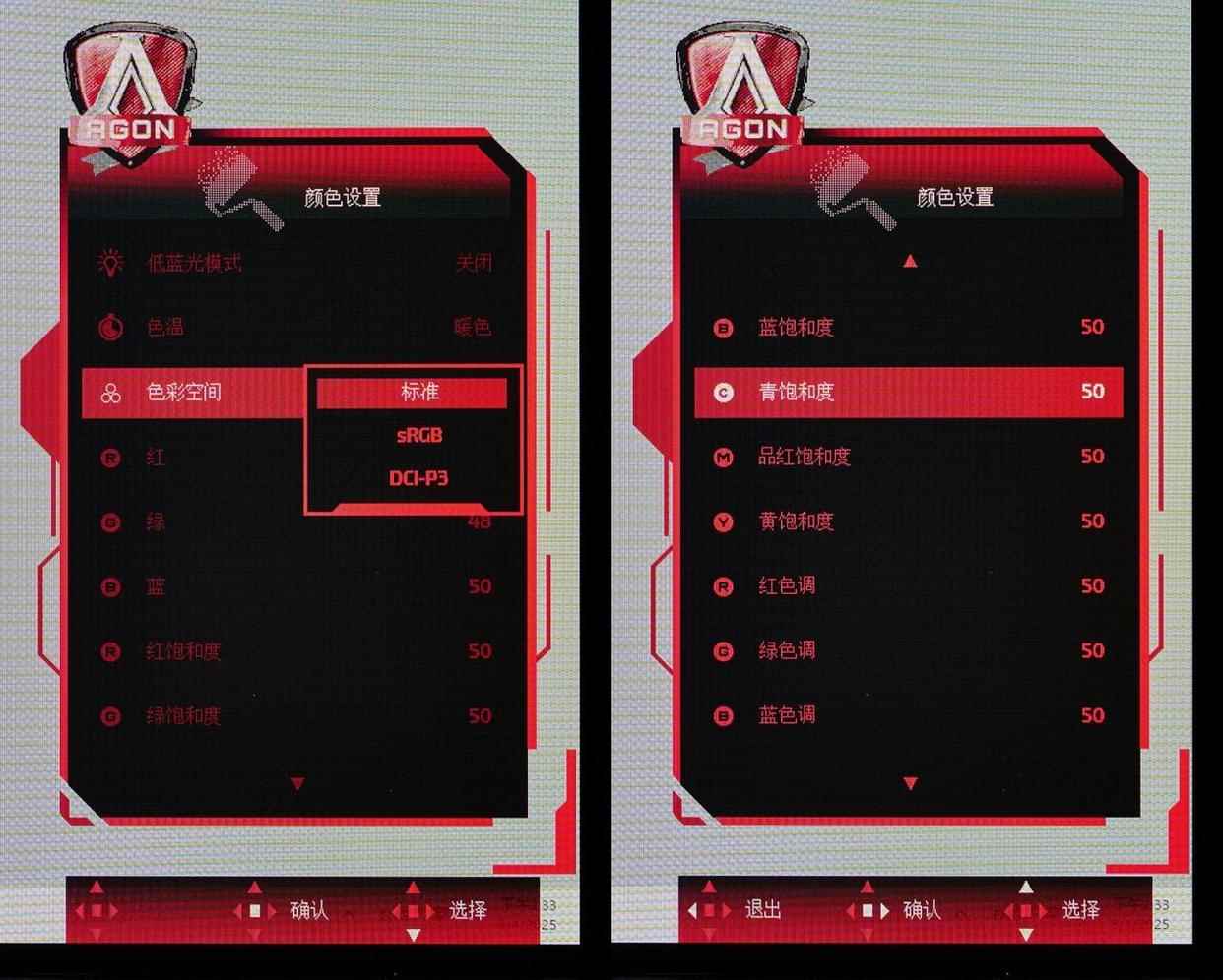 同时,颜色设置控制也具备了丰富的设计元素。首先,在色彩空间表现方面,提供了标准、sRGB以及DCI-P3三种不同的色彩空间选择。接着,AGON AG276UZD QD-OLED显示器还配备了色彩6轴调整功能(R/G/B/C/Y/M),允许用户利用专业的调色设备,进行色相与饱和度的精细调整,从而使色彩显示更加精确和自然。