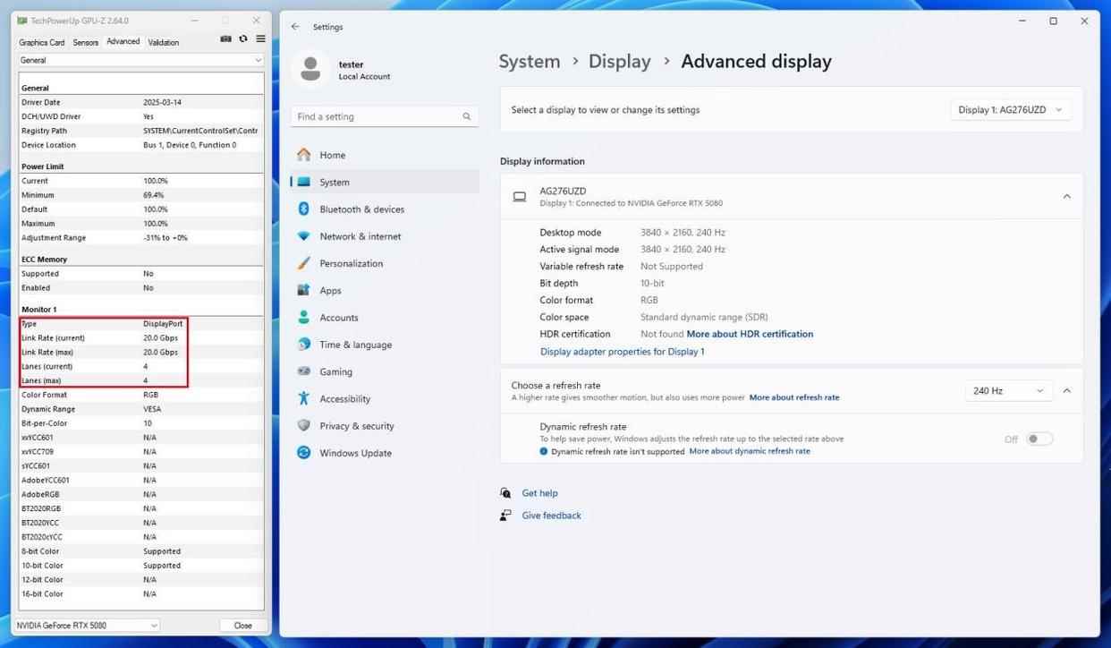 如何查看带宽?只需运行GPU-Z软件,切换至Advanced选项卡中的General卡页,查看Monitor显示器连接部分即可得知。RTX 5080火神显卡连接至原生DP 2.1a接口,单通道带宽为20Gbps,四通道则可达到最大80Gbps的带宽;同时,在系统显示信息中,我们也可以看到显示器分辨率为3840*2160(即4K),刷新率为240Hz,实现了高分辨率与高刷新率的完美结合。